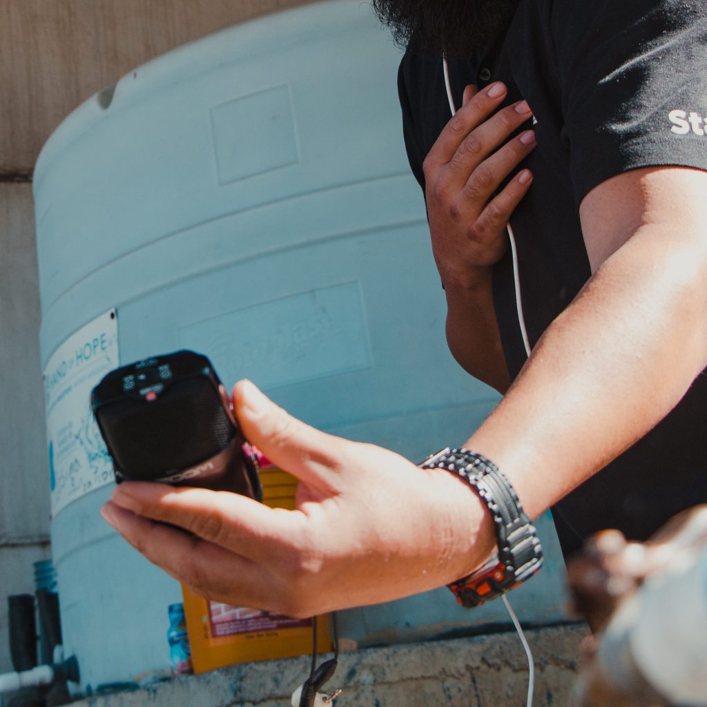 Nous plaçons notre cabine sonore dans un endroit calme et nous invitons les participant•es à s’installer individuellement en face du micro, un casque sur les oreilles.